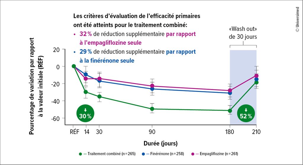 Fig.1: Étude CONFIDENCE – critère d’évaluation primaire: une réduction de 30% du ratio albumine/créatinine urinaires (UACR) a été obtenue après 30 jours sous le traitement combiné par finérénone + empagliflozine, et de 52% après 180 jours. Après un «wash out» de 30 jours, l’effet était réversible (modifiée selon Agarwal R et al. 2025)6
