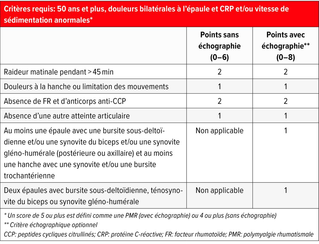 Les caractéristiques clés de la PMR sont caractérisées par des douleurs proximales au niveau de l’épaule et de la ceinture pelvienne, typiquement associées à une raideur matinale pendant >45 minutes et à une activité inflammatoire humorale accrue avec une CRP élevée et/ou une VS élevée. Il existe parfois aussi des symptômes constitutionnels comme la fièvre, les sueurs nocturnes, la fatigue et, plus rarement, la perte de poids.