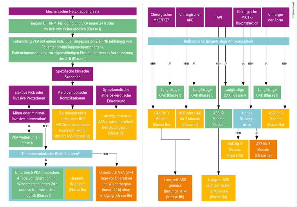 In den aktualisierten Leitlinien finden sich neu, sicherlich im Interesse der Leserschaft dieses Journals, übersichtlich gestaltete Algorithmen zum empfohlenen antithrombotischen Vorgehen nach allen Typen von Herzklappeneingriffen (Abb. 2). Zudem wurden mehrere neue Empfehlungen zur Handhabung der oralen Antikoagulation nach Implantation mechanischer Klappenprothesen, zur überbrückenden Antikoagulation («Bridging») vor und nach nichtkardialen Eingriffen sowie zur Bedeutung der Patient:innenschulung aufgenommen. Schließlich wird die zunehmende Rolle direkter oraler Antikoagulanzien bei Patient:innen mit biologischer Klappenprothese und bestehender Indikation zur oralen Antikoagulation hervorgehoben.
