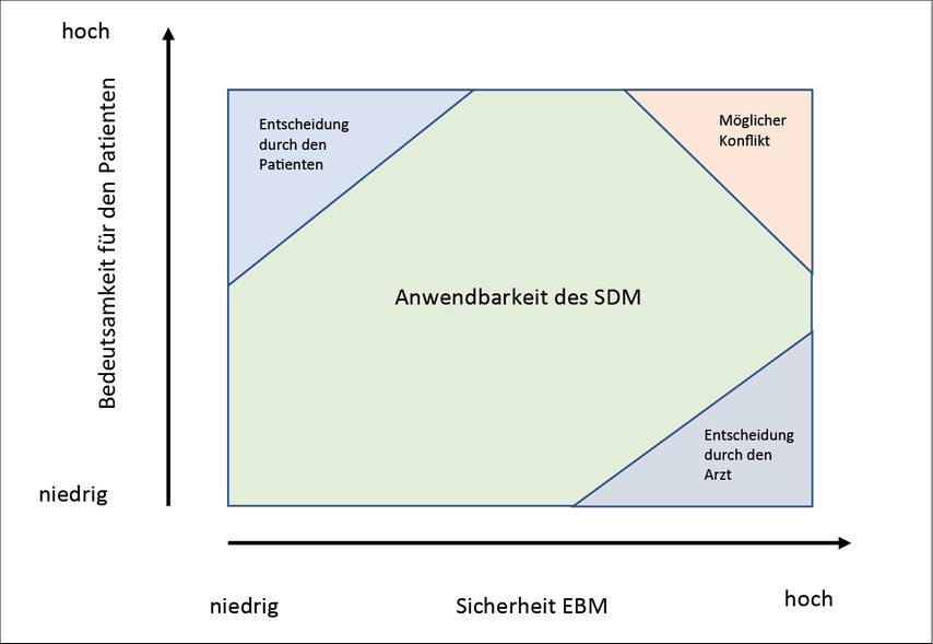 Das klinische Modell des SDM beruht im Wesentlichen darauf, dass mindestens zwei therapeutische Optionen inklusive Abwarten zur Auswahl stehen, die auf der Grundlage evidenzbasierter Medizin stehen. Die Vorgehensweise des SDM beinhaltet einen Interaktionsprozess zwischen Arzt/Ärztin und Patient:in, bei dem gleichberechtigt eine gemeinsame Übereinkunft betreffend eine Behandlung herbeigeführt wird. Dabei sollten bestimmte Merkmale berücksichtigt werden. Der SDM-Prozess kann nur zwischen zwei und mehr Personen erfolgen. Neben Arzt/Ärztin und Patient:in können weitere Personen hinzugezogen werden. So können sowohl Angehörige Anteil am SDM-Prozess haben als auch, wie in weiterentwickelten Konzepten wie dem Share-to-Care-Konzept, institutionell eingebundene nicht ärztliche Fachpersonen als «decision coaches» beteiligt werden.1 Alle involvierten Personen nehmen aktiv am Entscheidungsprozess teil. Dies beinhaltet einen Informationsaustausch, bei dem die Ärzt:innen die Rolle der fachlichen Expert:innen und die Patient:innen die Rolle der «Ich-Expert:innen» innehaben.