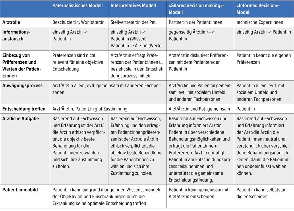 Der Prozess des SDM befindet sich somit in einem Spannungsfeld zwischen dem früher überwiegend vorherrschenden paternalistischen Entscheidungsmodell, bei dem die Ärzt:innen allein entscheiden, und dem informierten Entscheidungsmodell, bei dem die Patient:innen allein die Entscheidung treffen und die Ärzt:innen dem lediglich zustimmen. Neben dem paternalistischen Modell, dem SDM und dem informierten Modell besteht zudem auch das interpretative Modell. Dabei werden zwar die Präferenzen der Patient:innen erfragt, aber die Therapieentscheidung wird, ähnlich wie beim paternalistischen Modell, einseitig von den Ärzt:innen getroffen. Die vier Modelle im klinischen Kontext sind in Tabelle 1 angeführt.