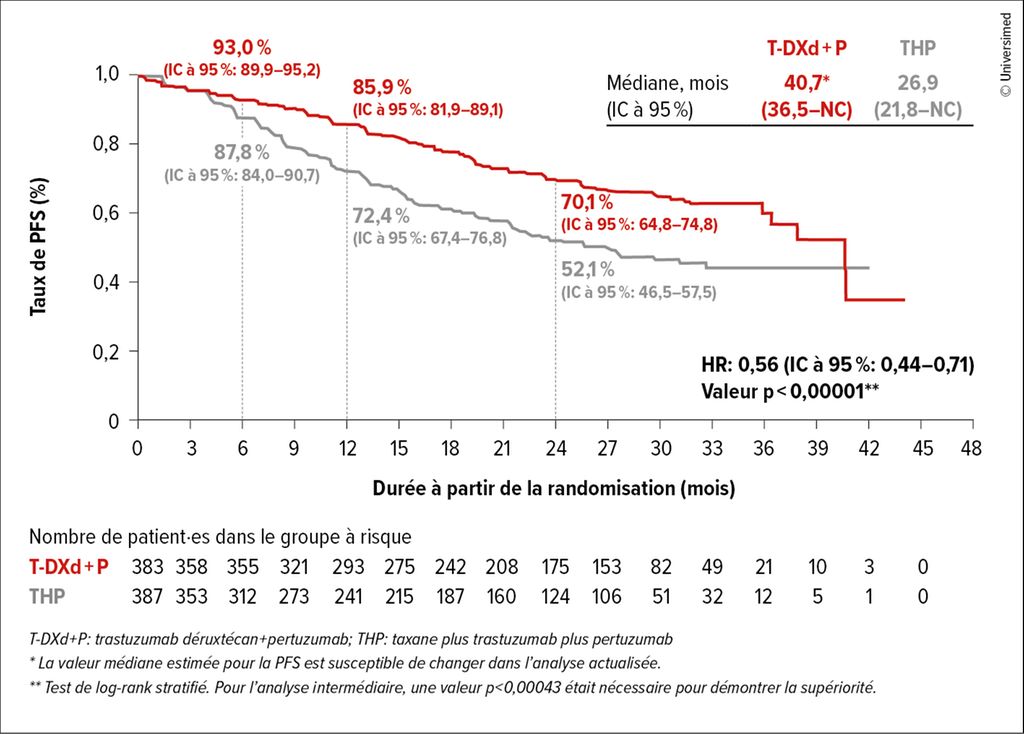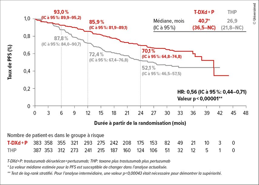 La PFS a été prolongée de manière statistiquement significative et cliniquement pertinente sous T-DXd plus pertuzumab en première ligne par rapport au THP (HR: 0,56; IC à 95%: 0,44–0,71; p<0,0001; Fig.1). La PFS médiane des patient·es était de 40,7 par rapport à 26,9 mois. Le taux de PFS était de 85,9 par rapport à 72,4% après 12 mois et de 70,1 par rapport à 52,1% après 24 mois. L’avantage en termes de PFS a été constaté de manière cohérente dans les sous-groupes pré-spécifiés. Une réponse a été observée chez 85,1 par rapport à 78,6% des patient·es, avec une durée médiane de la réponse de 39,2 par rapport à 26,4 mois. Après 24 mois, 73,3 par rapport à 54,9% des patient·es étaient encore en rémission durable. On a également observé un effet thérapeutique sur la PFS2. 32,4 par rapport à 46,8% des patient·es ont reçu un traitement de deuxième ligne après l’arrêt du médicament à l’étude. Le risque de progression sous traitement de deuxième ligne a été réduit de 40% dans le bras sous T-DXd plus pertuzumab par rapport au bras sous THP (HR: 0,60; IC à 95%: 0,45–0,79; p=0,00038). Le profil de sécurité de l’association T-DXd plus pertuzumab était cohérent avec les profils connus de chaque substance.