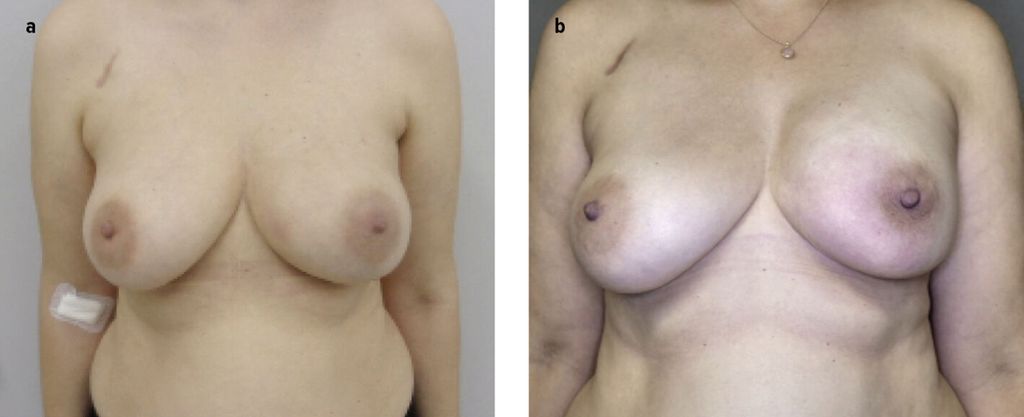 Fig. 1: Reconstruction mammaire par implant, à gauche: a) en préopératoire, b) trois mois après l’opération (image reproduite avec l’aimable autorisation de la patiente)