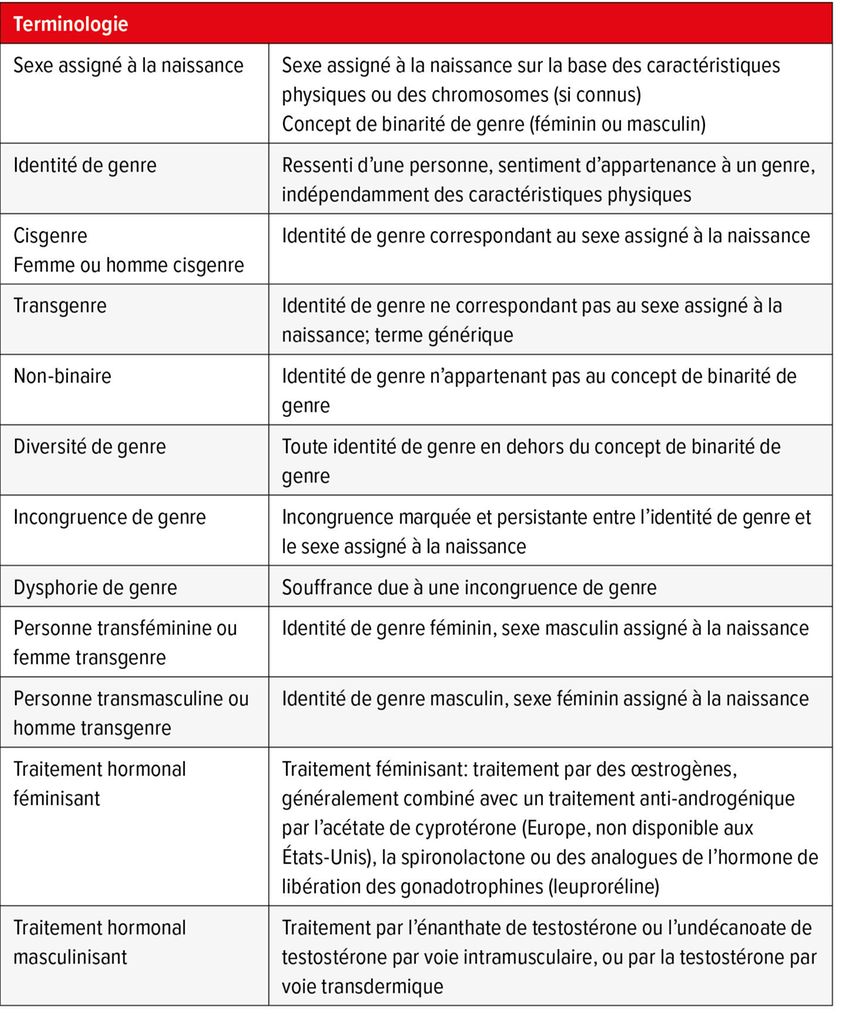 Les études épidémiologiques estiment la prévalence des personnes TGD dans la population occidentale à environ 0,5%, bien que ce chiffre soit souvent plus élevé dans les enquêtes menées auprès de la population.1 La nouvelle version de la CIM-11 a supprimé l’incongruence de genre de la catégorie des troubles mentaux, ce qui reflète la compréhension actuelle de l’identité de genre. Chez les personnes TGD, l’identité de genre ne correspond pas au sexe assigné à la naissance et peut entraîner une souffrance au sens d’une dysphorie de genre (aperçu de la terminologie utilisé dans le Tableau 1). L’un des principaux objectifs du traitement est d’atténuer les symptômes de l’incongruence de genre et d’obtenir des changements physiques qui correspondent à l’identité de genre. Le souhait de mesures de réassignation sexuelle varie d’une personne à l’autre. Le traitement hormonal joue un rôle central dans ce processus et la majorité des personnes concernées y ont recours.1 Les effets positifs du GATH sur la santé mentale et physique sont bien documentés.2,3