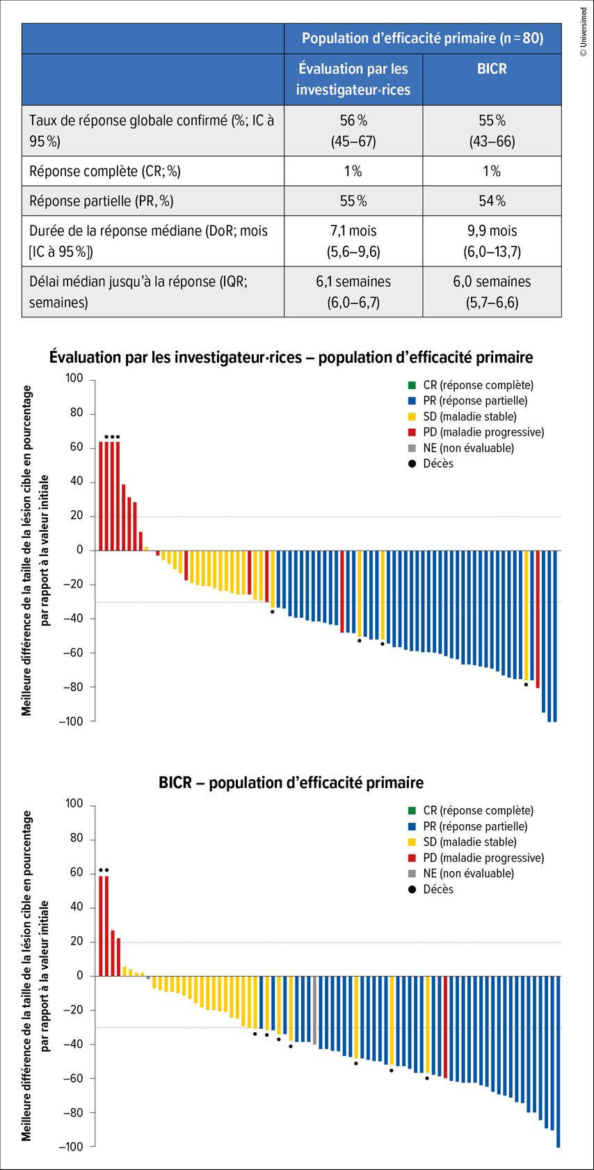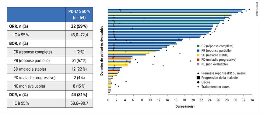 Le critère d’évaluation primaire de l’étude était le taux de réponse globale (ORR) évalué par un comité indépendant. Celui-ci était de 55% (IC à 95%: 43–66) avec une durée de la réponse médiane (DoR) de 9,9 mois (IC à 95%: 6–13,7; Fig.2).