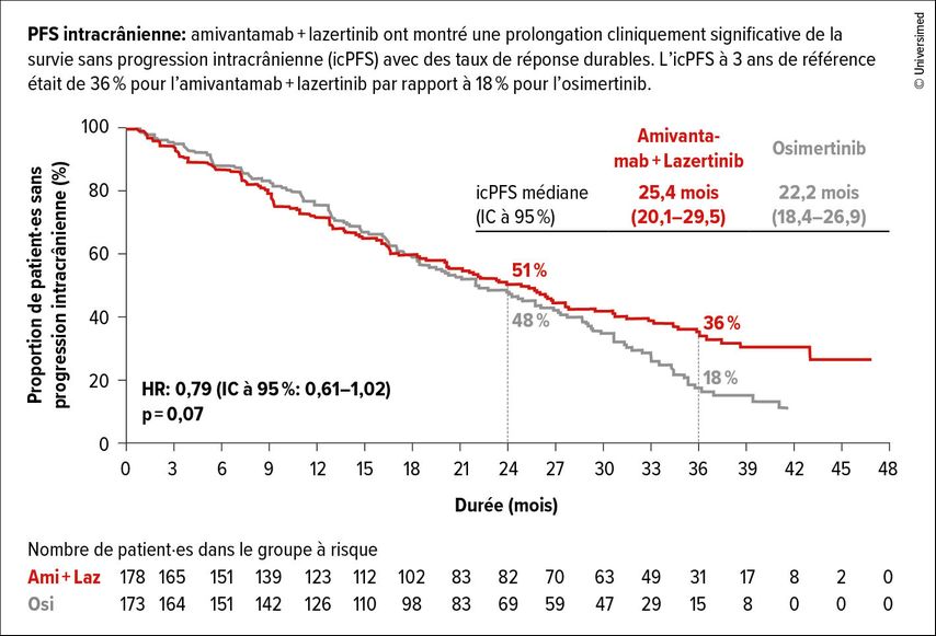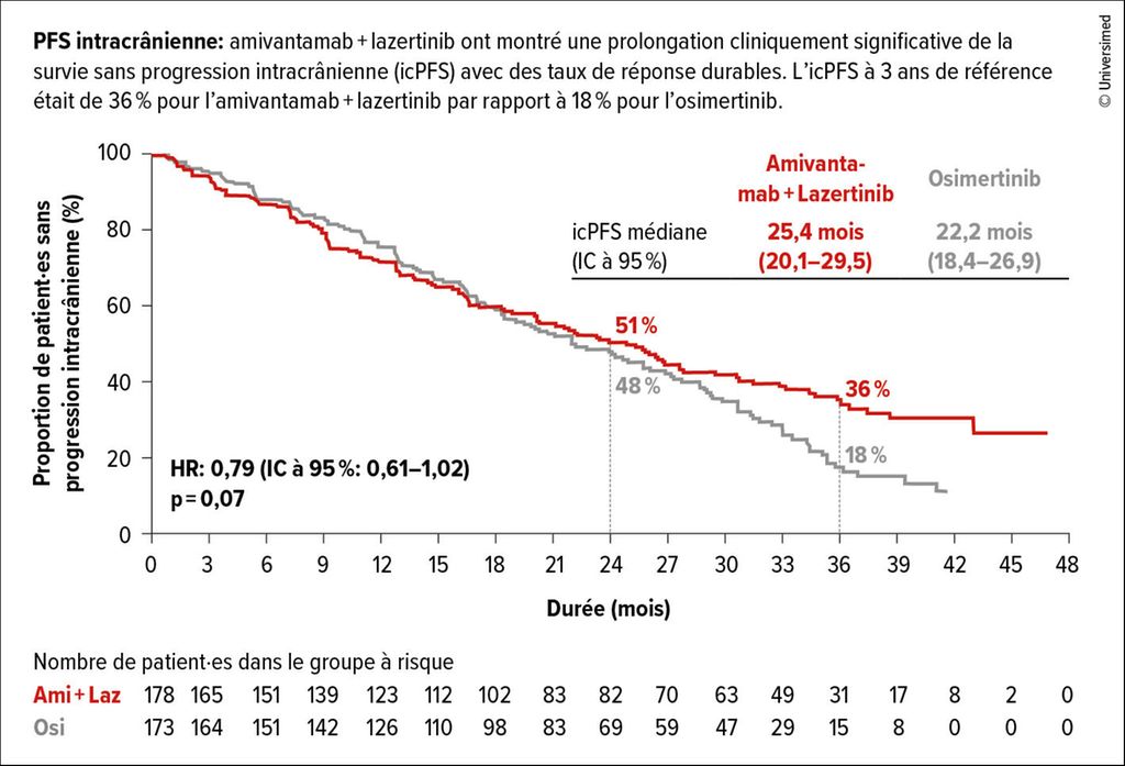 Dans cette analyse, la durée de suivi médiane est de 37,8 mois. Après 36 mois, 51% des patient·es du bras sous Osi et 60% des patient·es du bras sous Ami et Laz étaient encore en vie (HR:0,75; p<0,005). À trois ans, la PFS intracrânienne était de 36% dans le bras de traitement par rapport à 18% sous Osi (HR:0,79; p=0,07; Fig.1). De plus, le délai jusqu’à la progression symptomatique a pu être prolongé sous Ami et Laz par rapport à sous Osi (43,6 par rapport à 29,3 mois; HR:0,69; p<0,001).