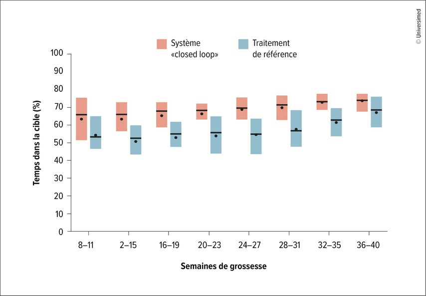 La grossesse est une période particulièrement difficile pour les femmes atteintes de diabète de type 1, car les besoins en insuline changent, a expliqué l’expert. Un contrôle insuffisant de la glycémie (dysglycémie) augmente le risque de complications, par exemple d’évolutions difficiles pouvant entraîner la perte de l’enfant à naître ou de complications graves après la naissance avec hypoglycémie néonatale. L’essai randomisé contrôlé CONCEPTT portant sur l’utilisation de la CGM pendant la grossesse a fourni des preuves claires que toutes les patientes atteintes de diabète de type 1 devraient porter un capteur, a déclaré M. Laimer. Il est intéressant de noter que seules des améliorations mineures du taux d’HbA1c ont été observées, bien que la glycémie maternelle ait baissé de manière significative, sans hypoglycémie supplémentaire. En outre, la fréquence des enfants LGA («large for gestational age») et la durée d’hospitalisation des nourrissons avaient été réduites.6Cela illustre le fait qu’il ne s’agit pas seulement de réduire le taux d’HbA1c et la glycémie totale, mais aussi les variations de la glycémie. La cible pendant la grossesse est plus étroite, à savoir entre 3,5 et 7,8mmol/l. Il faut viser un TiR de 70% (Fig.1), a déclaré M. Laimer. Il a souligné que le GMI («glucose management indicator»), souvent utilisé comme taux d’HbA1c calculé pour évaluer le contrôle de la glycémie, n’est pas fiable et n’est pas recommandé pendant la grossesse. Les systèmes myLife CamAPS® FX7 et Medtronic MiniMedTM 780G8 ont été testés pendant la grossesse. Pour tous les autres systèmes, la décision doit toujours être prise individuellement avec la patiente.
