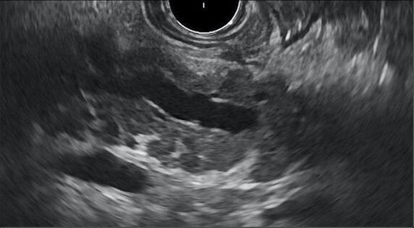 Fig.1: Image d’endo-échographie d’une pancréatite chronique. Nos données montrent que la pancréatite chronique est plus fréquente chez les personnes vivant avec le VIH que dans la population séronégative pour le VIH. Elle est présente chez 21% des personnes examinées, alors que la prévalence chez les personnes séronégatives pour le VIH est de 1‰ maximum selon la littérature (Göbbert A. 2023).10