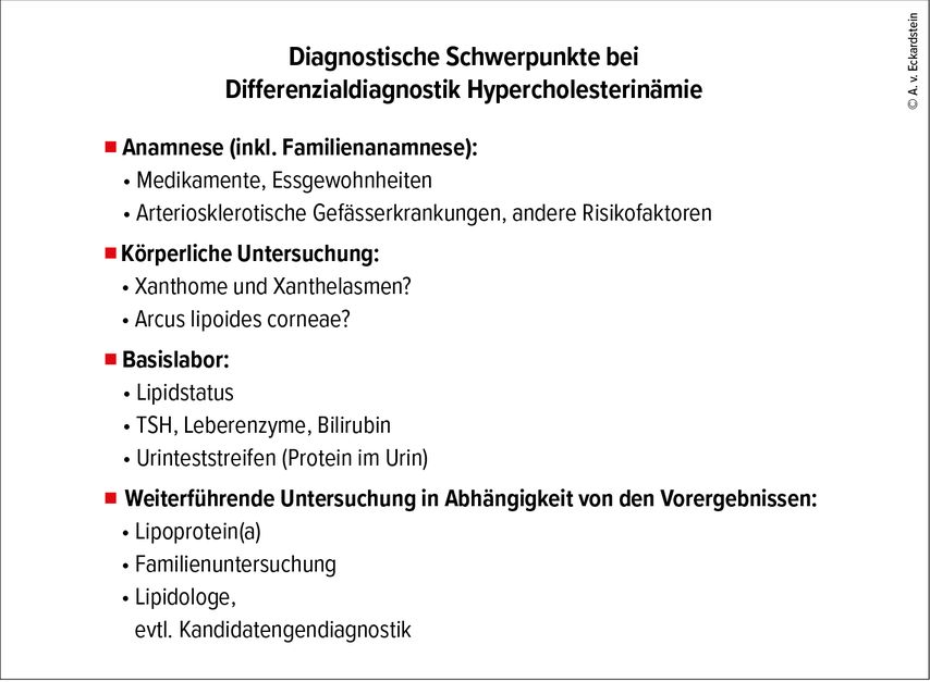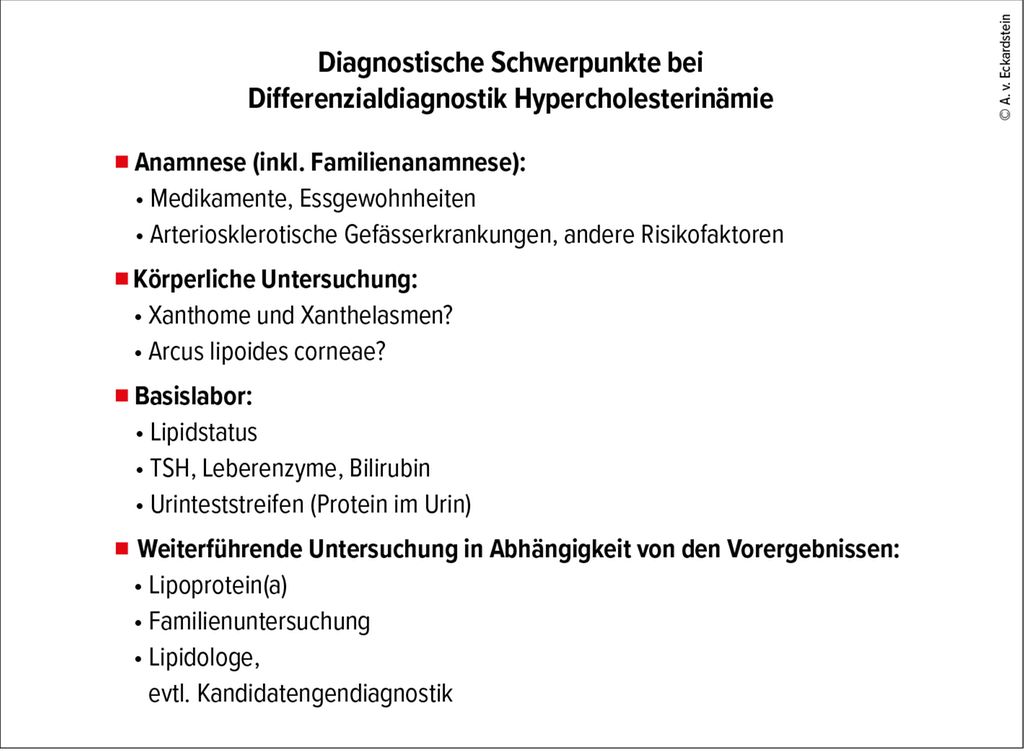 Bei der Ursachenklärung einer Hypercholesterinämie sollte anamnestisch nach Medikamenteneinnahme gefragt sowie die Familienanamnese erhoben werden. Laborchemisch werden Blutfette, Lipoprotein(a), Schilddrüsen- und Leberwerte, Bilirubin i. S. und Protein im Urin bestimmt, um sekundäre Ursachen auszuschliessen.