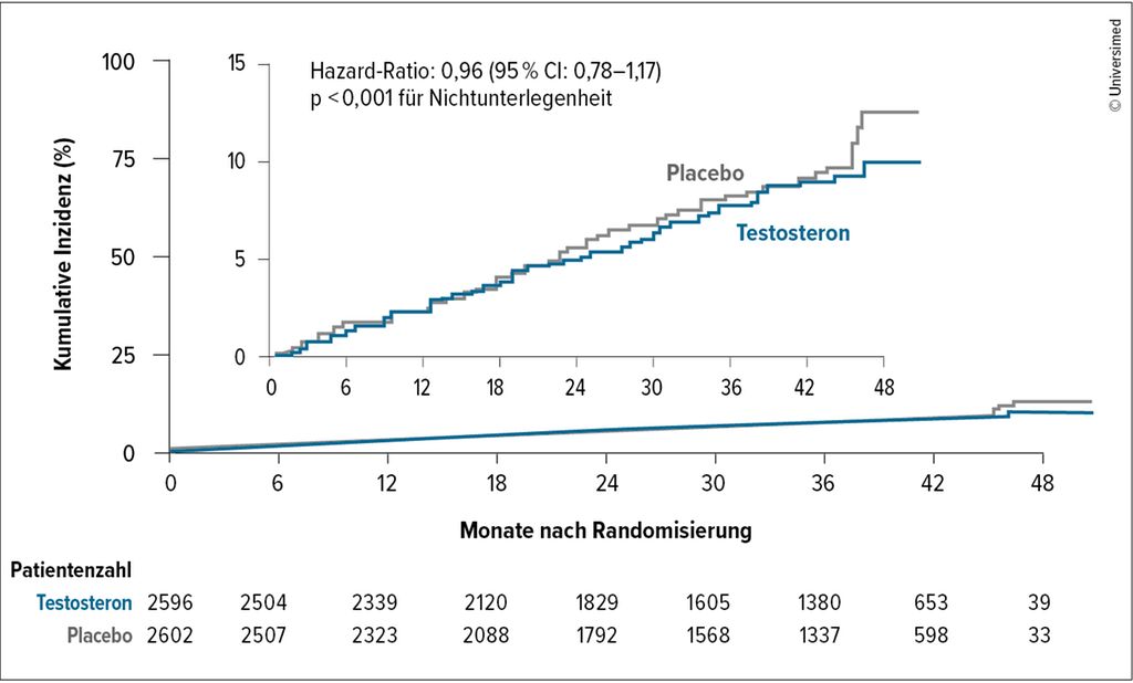 Mit der Publikation der TRAVERSE-Studie 2023 im NEJM mit dem Titel „Cardiovascular Safety of Testosterone-Replacement Therapy“ sollte sich die Datenlage zugunsten der Sicherheit der TRT jedoch deutlich ändern. Publiziert von Michael Lincoff et al.15 lag nun endlich eine methodisch solide Studie vor. Die bisher größte prospektive randomisierte, placebo-kontrollierte Nichtunterlegenheitsstudie zeigte keine Zunahme schwerer KV Ereignisse („major adverse cardiovascular events“; MACE) im Vergleich zu Placebo. Die Hazard-Ratio für das primäre KV Studienziel lag bei knapp 1, das Ziel der Nichtunterlegenheit wurde somit erreicht. Es wurden 5246 Männer im Alter von 45–80 Jahren rekrutiert. Alle eingeschlossenen Patienten litten an einem klinisch relevanten Hypogonadismus mit laborchemisch bestätigten niedrigen Testosteronwerten (<300ng/dl). Zusätzlich war eine vorbestehende KV Erkrankung oder zumindest ein erhöhtes Risiko für eine KV Erkrankung notwendig für den Einschluss. Anschließend erfolgte die Randomisierung zu transdermalem Testosteron-Gel oder Placebo, welches je nach Testosteronwert dosisadaptiert wurde. Die Datenerhebung erfolgte über einen mittleren Beobachtungszeitraum von 2–3 Jahren (33,0 ± 2,1).