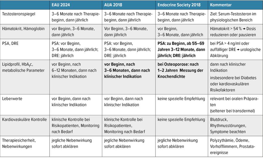 Regelmäßige Kontrollen von Testosteron, Hämatokrit, PSA, Lipidprofil und HbA1c sind wichtig; Vorsicht bei Vorhofflimmern, Herzinsuffizienz und Polyzythämie; Therapiebeginn nach akutem Koronarsyndrom frühestens nach 6 Monaten.