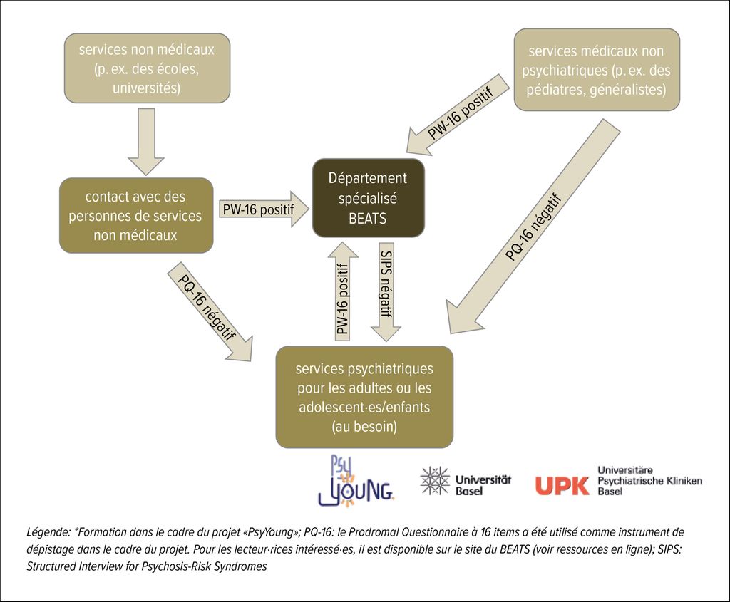 Le dépistage et l’intervention précoces en matière de psychose doivent répondre à une mission en apparence contradictoire: atteindre le plus grand nombre possible de personnes présentant un risque accru de développer une maladie psychotique, tout en identifiant de manière aussi spécifique que possible uniquement ce groupe de personnes. Afin d’y parvenir plus efficacement, deux instruments de pré-dépistage ont été utilisés dans le cadre de «PsyYoung». D’une part, un «calculateur de risque» a été mis en œuvre; à partir de variables sociodémographiques et d’informations issues des demandes d’orientation, il permet, grâce à un modèle prédictif, d’estimer le risque de transition d’un état à haut risque vers une psychose avérée. D’autre part, le Prodromal Questionnaire à 16 items (PQ-16) a été utilisé comme outil de dépistage (voir également les ressources en ligne). Dans le cadre de la mise en œuvre de «PsyYoung», ces instruments ont permis d’optimiser le parcours d’orientation vers le BEATS (voir Fig.1).