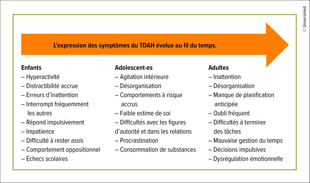 Le TDAH peut être considéré comme un exemple typique de trouble du développement. Ainsi, dans la CIM-11, le TDAH est également classé parmi les «troubles neurodéveloppementaux». La prévalence du TDAH est d’environ 5,9% durant l’enfance et l’adolescence; elle diminue à environ 2,5% à l’âge adulte. Les trajectoires développementales sont toutefois très hétérogènes et s’accompagnent le plus souvent d’une modification de la symptomatologie. La symptomatologie centrale – hyperactivité motrice, impulsivité et troubles de l’attention – évolue également au fil du temps. Alors que chez les enfants, l’agitation motrice ou l’ensemble des trois symptômes centraux prédominent généralement simultanément, ce tableau se transforme à l’âge adulte. En particulier chez les personnes disposant d’une bonne capacité d’introspection et de ressources cognitives élevées, cette symptomatologie tend à se manifester par une agitation intérieure ou un sentiment constant d’«être poussé·e». Bien que la capacité attentionnelle augmente globalement avec l’âge, elle demeure limitée chez les adultes atteint·es de TDAH par rapport à leurs pair·es. L’impulsivité tend le plus souvent à diminuer au fil du temps, en raison du renforcement des mécanismes de contrôle liés à la maturation. À l’inverse, l’instabilité émotionnelle et les fluctuations de l’humeur peuvent gagner en importance. Lors de la phase de transition, les comorbidités revêtent une importance majeure dans le cadre du TDAH. Ce sont fréquemment elles qui déterminent les priorités thérapeutiques et altèrent la qualité de vie des personnes concernées.