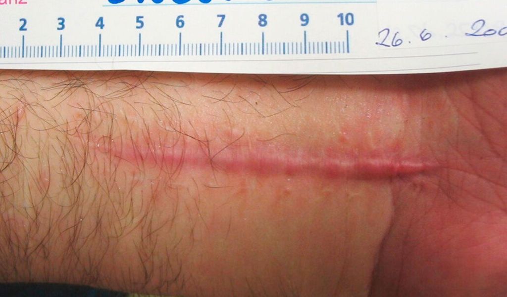 Abb. 1: Zustand nach palmarer Radiusverplattung mit hypertropher Narbe 11 Monate postoperativ