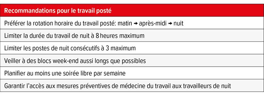 Tab.1: Recommandations pour le travail posté