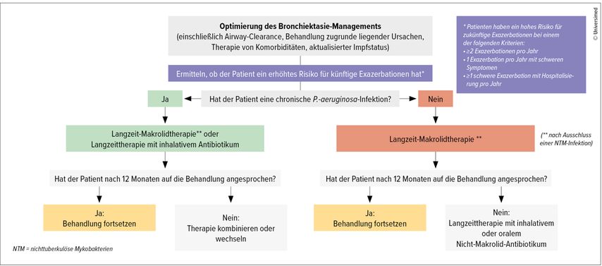 Abb. 1: ERS-Algorithmus für die Langzeitbehandlung mit Antibiotika bei Patienten mit Bronchiektasie (modifiziert nach Chalmers JD et al. 2025)1