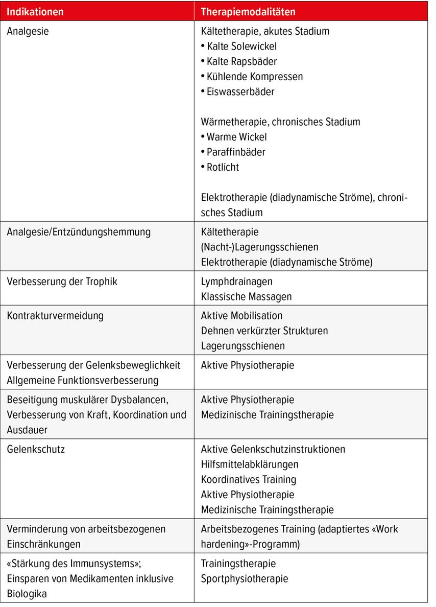 Abbildung 1 gibt basierend auf den aktuell gültigen Behandlungsempfehlungen der EULAR zur Therapie der rheumatoiden Arthritis2 Hinweise und Hilfestellung zum Einsatz der physikalischen und physiotherapeutischen Massnahmen entlang des empfohlenen Behandlungspfads. Tabelle 1 fasst die Indikationen und die Therapiemodalitäten zusammen.