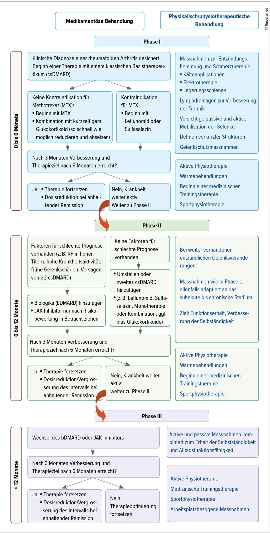 Abb. 1: Therapiealgorithmus für die rheumatoide Arthritis: medikamentös (nach Smolen JS et al. 2023)2 und physikalisch/physiotherapeutisch