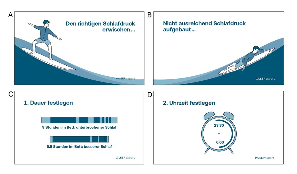 Abb. 1: Elemente des Behandlungsprogramms SLEEPexpert. A. Das Behandlungsprogramm betont, dass der Aufbau von Schlafdruck über eine ausreichend lange Wachphase entscheidend wichtig ist, um zu schlafen. Im Programm wird das Bild eines Surfers genutzt, der eine ausreichende Welle benötigt, um zu surfen. B. Hier hat der Surfer keine ausreichende Welle und kann nicht surfen, so wie eine Person ohne ausreichenden Schlafdruck – zum Beispiel wegen langer Bettzeiten am Tag – nicht gut schlafen kann. C und D. Im Programm wird ein individuelles Schlaffenster in zwei Schritten festgelegt. In einem ersten Schritt wird die Dauer festgelegt, angepasst an die berichtete aktuelle Schlafdauer. In einem zweiten Schritt wird die Uhrzeit festgelegt, angepasst an persönliche Präferenzen beziehungsweise Verpflichtungen des Alltags. Weitere Informationen finden Sie unter www.sleepexpert.ch