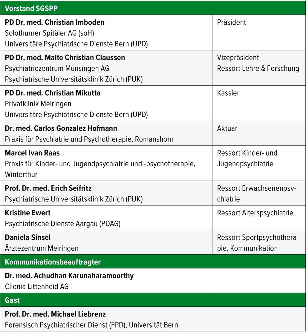 Die SGSPP hat sich an ihrer Mitgliederversammlung in Chur dazu entschieden, die Kriterien für eine ordentliche Mitgliedschaft neben Fachärzt:innen für Psychiatrie und Psychotherapie auf psychologische Psychotherapeut:innen auszuweiten. Auch Psycholog:innen und Ärzt:innen in Weiterbildung zu den entsprechenden Fachtiteln können ordentliche Mitglieder in der SGSPP werden. Der Vorstand sieht dies als wichtiges Zeichen, um die Sportpsychiatrie und -psychotherapie als interprofessionelles Fachgebiet abzubilden sowie das Engagement von jungen Berufskolleg:innen anzuerkennen und zu fördern. Anlässlich einer Vorstands-Retraite im Mai wurden die Schwerpunktthemen der SGSPP geschärft. Die SGSPP fokussiert sich darauf, regelmässige Weiter- und Fortbildungen sowohl im eigenen Curriculum als auch durch die Jahrestagung sowie eine Präsenz am PSY-Kongress anzubieten. Des Weiteren fördert sie den Austausch zwischen Fachpersonen, die sich sportpsychiatrisch betätigen, und unterstützt Mitglieder im Aufbau entsprechender Angebote. Die Zusammenarbeit mit verschiedenen Berufsgruppen, die sich mit psychischer Gesundheit im Sport befassen, soll aktiv gepflegt und ausgebaut werden, insbesondere in Bezug auf ein Mental-Health- Screening für Athlet:innen.