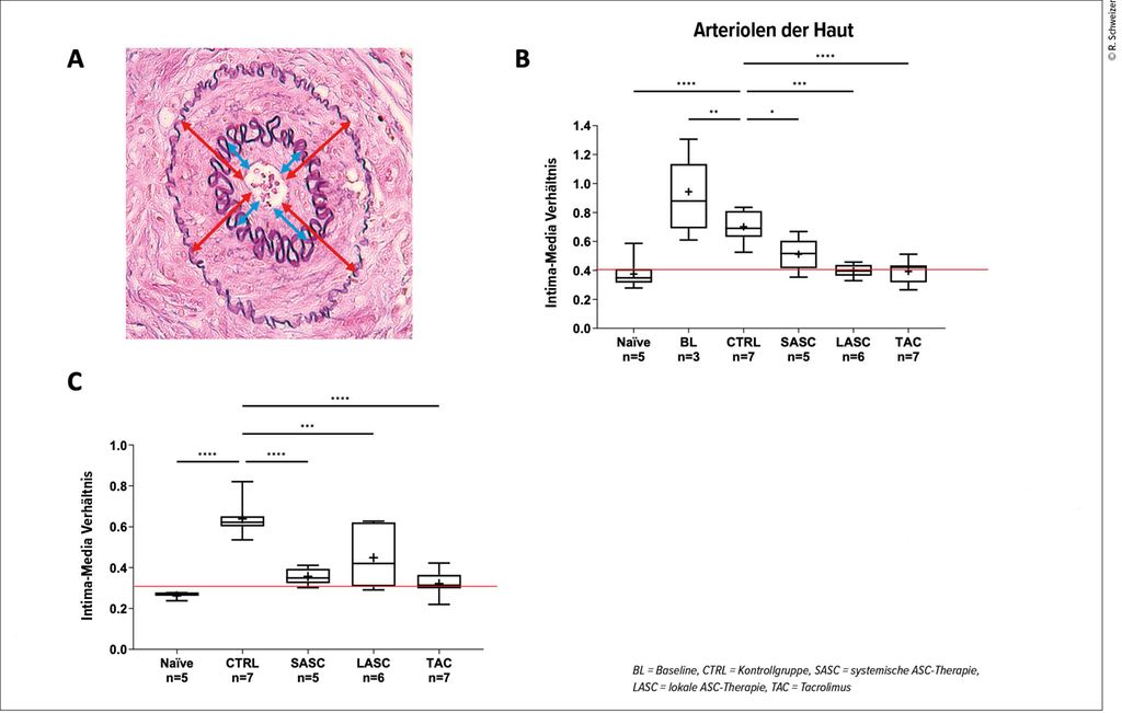 Abb. 4: Die Gefässwanddicke wurde in den verschiedenen Geweben des Transplantates gemessen und ein Intima-Media-Verhältnis als Indikator für die intimale Proliferation errechnet (A). Sowohl in Arteriolen der Haut (B) als auch der Muskeln (C) konnte eine signifikant reduzierte intimale Proliferation in den ASC-Gruppen gezeigt werden (nach Schweizer R et al. 2025)12