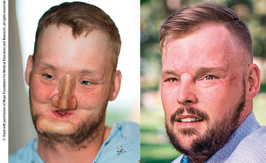 In der Welt der rekonstruktiven Chirurgie bietet die «vascularized composite allotransplantation» (VCA) eine Behandlungsoption, wenn traditionelle Rekonstruktionsmethoden an ihre Grenzen stossen. Bei der VCA werden komplexe Gewebekomposite, bestehend aus verschiedenen Gewebearten wie Haut, Muskeln, Nerven und Gefässen, transplantiert, um beispielsweise eine Hand oder ein Gesicht funktionell und ästhetisch wiederherzustellen. Weltweit wurden bereits mehrere Hundert solcher Eingriffe erfolgreich durchgeführt. Abbildung 1 zeigt ein Beispiel der ersten Gesichtstransplantation an der Mayo Clinic. Diese hochkomplexen Operationen erfordern jedoch eine präzise Indikationsstellung, sorgfältige Planung und ein erfahrenes, interdisziplinäres Team, das auf diesem Gebiet spezialisiert ist.1,2