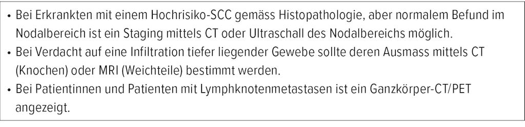 Prof. Stratigos ging im Weiteren auf die Rolle der Bildgebung beim CSCC ein. «Wir verfügen mittlerweile über viele tolle bildgebende Techniken, die wir heute auch viel häufiger einsetzen als früher», sagte er. Studien haben gezeigt, dass die Bildgebung dazu beiträgt, eine subklinische Erkrankung zu erfassen, und dass ihr Einsatz in 33% der Fälle das Staging und Management von Hochrisiko-CSCC verändert.2,3 Gemäss Guidelines sollte eine Bildgebung bei einem CSCC in drei Fällen eingesetzt werden (Tab. 1).4 «Eine Biopsie der Sentinellymphknoten dagegen wird aufgrund ihres unklaren Nutzens von den meisten Guidelines aktuell nicht empfohlen, ausser im Kontext einer klinischen Studie», ergänzte Prof. Stratigos.