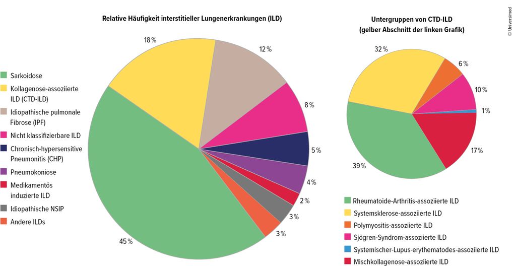 Abb. 1: Kollagenose-assoziierte ILD (CTD-ILD) machen 18 % der ILD aus und sind in weitere Untergruppen unterteilt. Mod. nach Wijsenbeek M et al.1