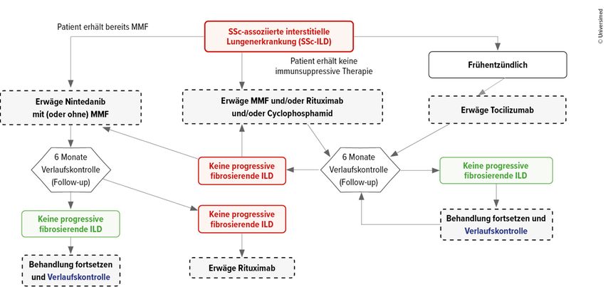 Besteht eine SSc-ILD, könne generell Nintedanib mit oder ohne Mycophenolat-Mofetil (MMF) gegeben werden, alternativ MMF und/oder Rituximab (RTX) und/oder Cyclophosphamid oder als dritte Option Tocilizumab. Letzteres insbesondere dann, wenn die Einschlusskriterien der entsprechenden Studie erfüllt seien, konkret falls eine frühe Erkrankung mit entzündlichem Phänotyp vorliegt (CRP erhöht, Arthritis, Myositis).13