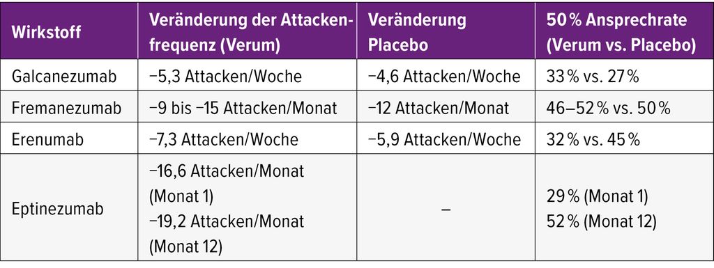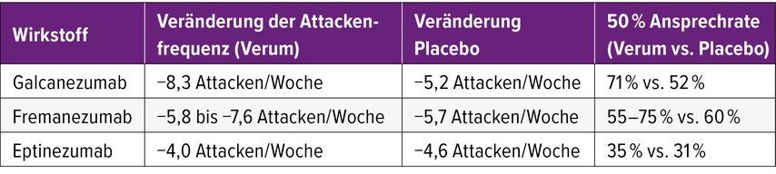 Tab. 2: Veränderung der Attackenfrequenz und 50-prozentige Ansprechrate verschiedener Anti-CGRP-mAbs gegenüber Placebo bei der Behandlung des episodischen Clusterkopfschmerzes8–10