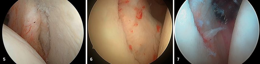 Der operative Eingriff wird in Beach-Chair- oder Seitenlagerung durchgeführt, wobei der betroffene Arm in einem Armhalter frei beweglich gelagert wird. Nach Etablierung der Standardportale – bestehend aus einem posterioren Portal zur Optik sowie anterior-inferioren und anterior-superioren Arbeitsportalen – erfolgt die arthroskopische Inspektion des Glenohumeralgelenks. Als Nächstes wird ein zusätzliches transsubskapuläres Portal (5-Uhr-Portal) angelegt (Abb.3). Die Frakturpräparation umfasst die Entfernung von Hämatom- und Interpositionsgewebe, die Mobilisation des Fragments sowie das Anfrischen der Frakturflächen zur Optimierung der knöchernen Heilung. Die Reposition erfolgt unter arthroskopischer Sicht mithilfe geeigneter Repositionsinstrumente, gegebenenfalls unterstützt durch temporäre Fixation mittels Kirschner-Draht (Abb.4).