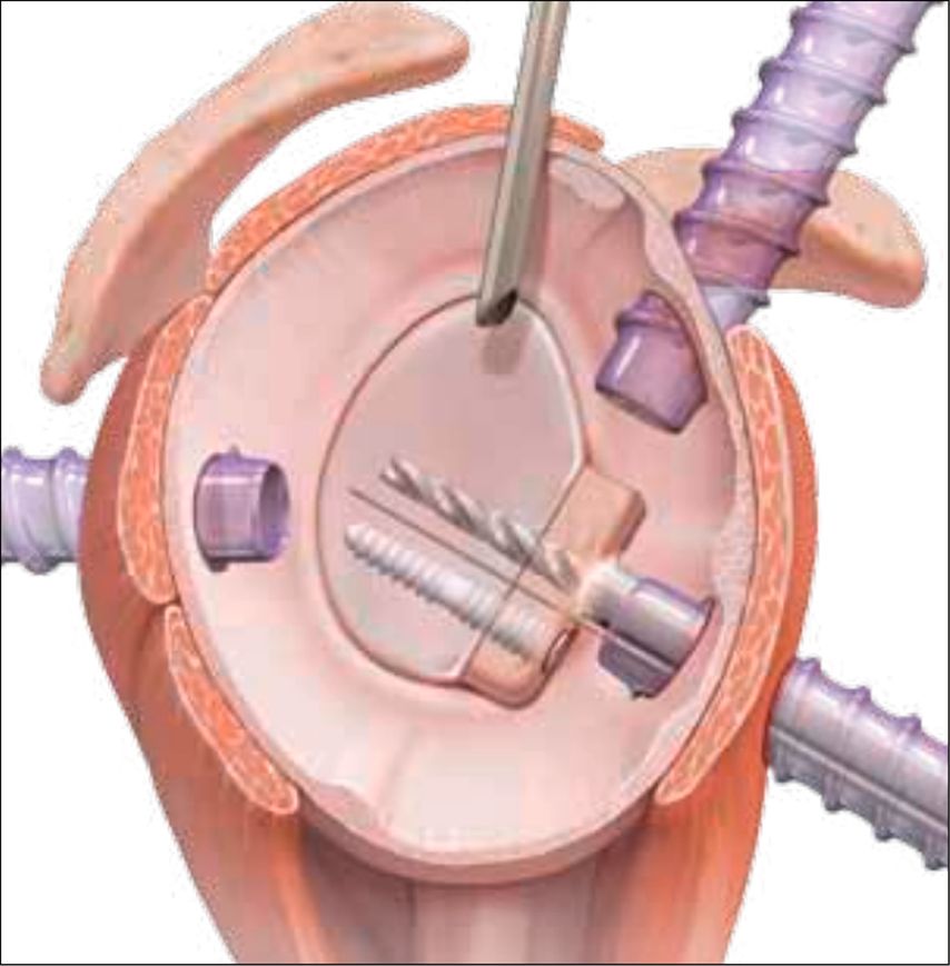 Zur definitiven Fixation stehen unterschiedliche Techniken zur Verfügung. Die arthroskopisch assistierte Schraubenosteosynthese wird meistens durch das 5-Uhr-Portal durchgeführt. Kanülierte Schrauben (2,7–3,5mm) bieten, insbesondere bei größeren, kompakten Fragmenten, eine hohe Primärstabilität, ihr Einsatz ist jedoch technisch anspruchsvoll und mit dem Risiko einer intraartikulären Implantatprominenz verbunden. In den letzten Jahren sind aber Systeme mit bioresorbierbaren Implantaten hinzugekommen, die für die vordere Glenoidaugmentation entwickelt wurden (Abb. 5). Dieses System eignet sich auch perfekt für die Fixation des Glenoidfragments.
