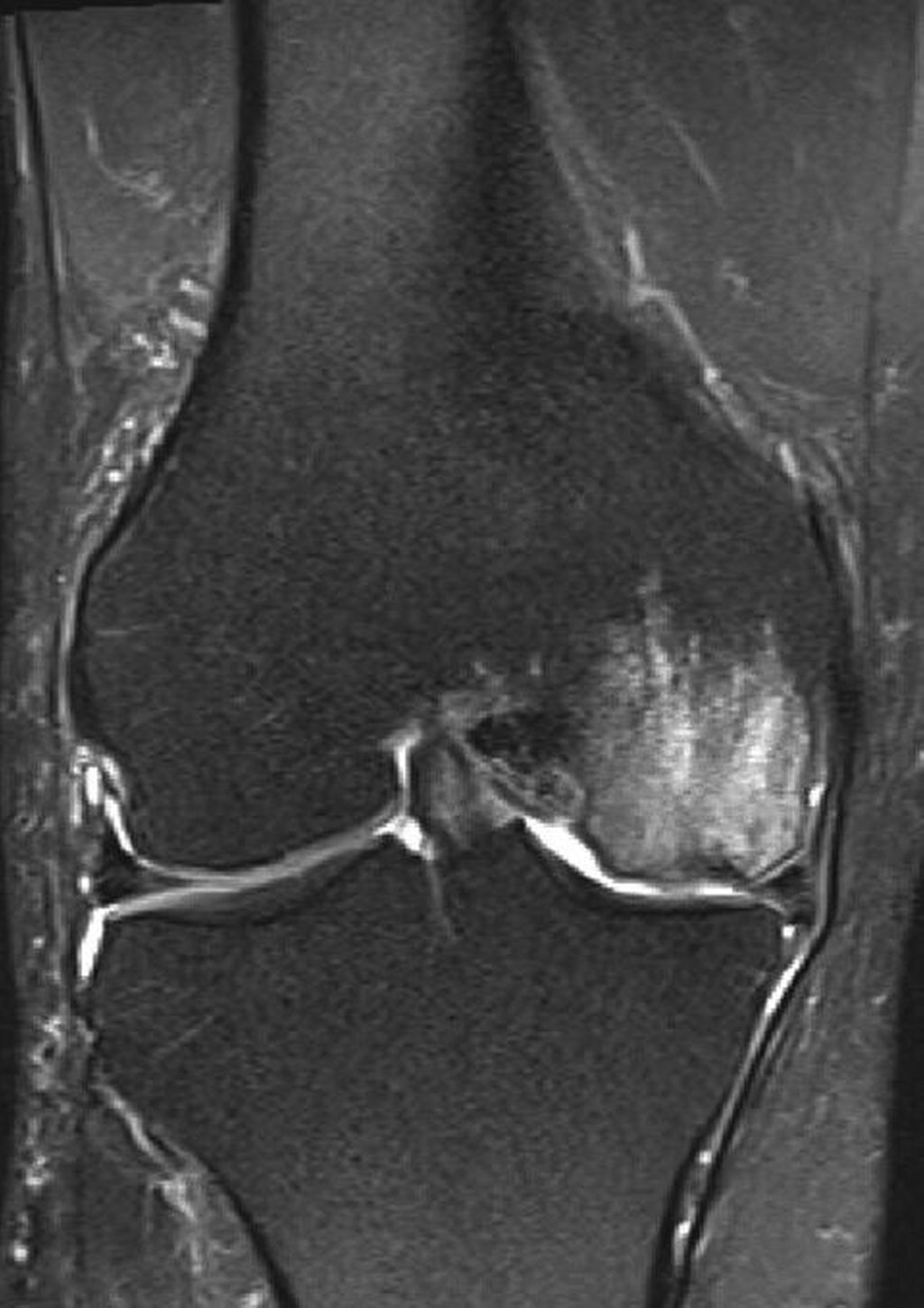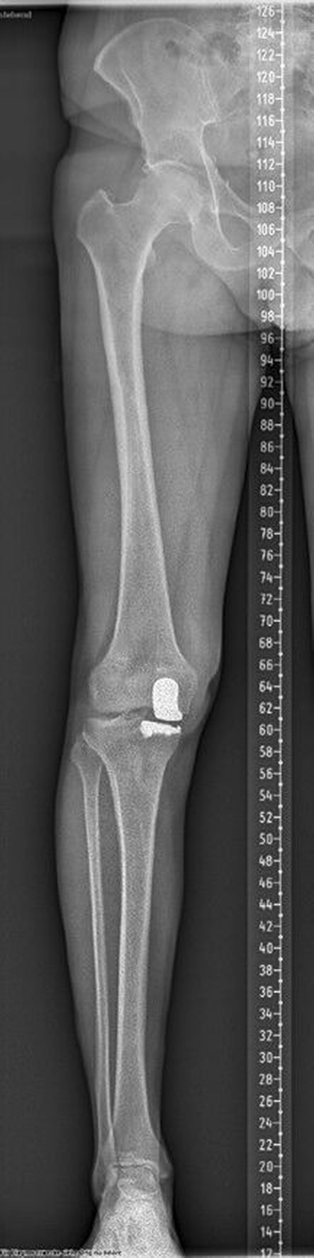Ein 62-jähriger Patient stellte sich im März 2025 mit belastungsabhängigen Knieschmerzen rechts vor. Im MRT zeigte sich eine Läsion des medialen Meniskus, sodass in Zusammenschau mit dem positiven Meniskuszeichen in der klinischen Untersuchung eine partielle Meniskektomie durchgeführt wurde. Die postoperative Phase verlief zunächst unauffällig. Der Patient berichtete über ein beschwerdefreies Intervall von rund sieben Wochen. Anschließend entwickelten sich jedoch erneut zunehmende Schmerzen im rechten Kniegelenk, die eine erneute Vorstellung in der Spezialambulanz erforderlich machten. Er berichtete vor allem über belastungsabhängige Schmerzen im Bereich des medialen Kniegelenks. Daraufhin wurde ein Ganzbeinröntgen zur Beurteilung der Beinachse durchgeführt, hier zeigte sich eine varische Beinachse mit 5 Grad Varus (Abb.1). In der ergänzend durchgeführten MRT-Untersuchung konnte medialseitig eine ausgeprägte Nekrosezone am medialen Femurkondyl nachgewiesen werden (Abb.2). Schlussendlich wurde aufgrund dieses Befundes die Indikation zur Implantation einer medialen Hemischlittenprothese rechts gestellt, die schließlich im August 2025 komplikationslos durchgeführt wurde (Abb.3+4).