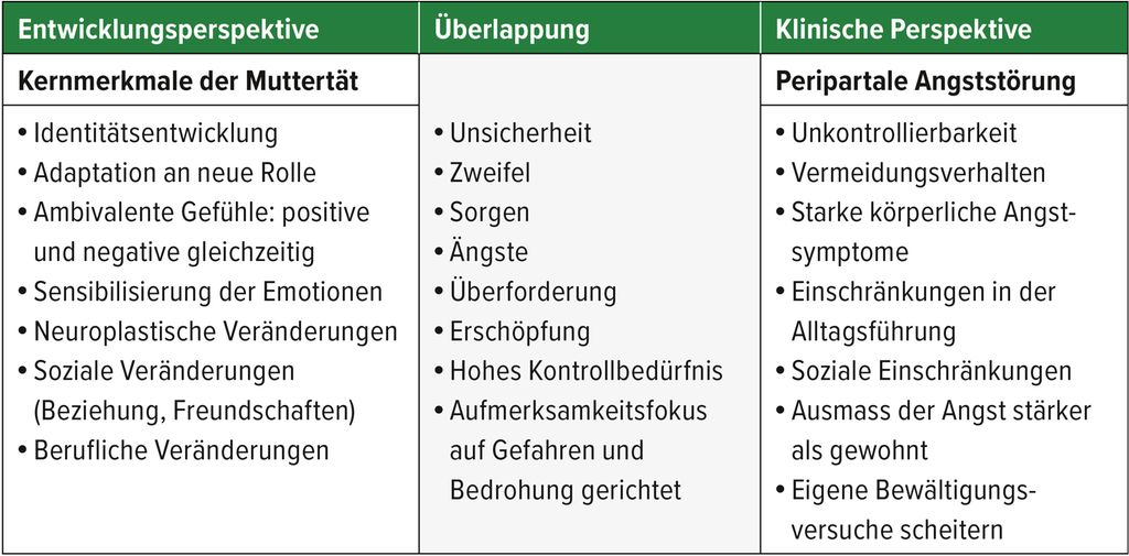 Mit Eintritt einer Schwangerschaft beginnt für eine Frau eine neue Entwicklungsphase, die Transformation von der Frau zur Mutter – bezeichnet als Matreszenz oder Muttertät.11–13 Dieser Prozess ist durch eine Vielzahl an Veränderungen auf körperlicher, psychischer, sozialer und beruflicher Ebene geprägt.13 In diesem Zusammenhang weist die Muttertät Parallelen zur Pubertätsphase auf, welche ebenfalls eine Übergangsperiode zwischen zwei Lebensabschnitten beschreibt.14 Das Konzept der Muttertät hat innerhalb der peripartalen Psychotherapie und Psychiatrie zunehmend an Aufmerksamkeit gewonnen und trägt zur Klärung der Unsicherheit bei, welche sich Fachpersonen und Betroffene gleichermassen stellt: Was sind normale Ängste und ab wann gelten die Ängste als Symptom einer klinischen Diagnose? Mithilfe dieser entwicklungspsychologischen Perspektive kann das bisherige Verständnis der peripartalen psychischen Gesundheit von Müttern bereichert und erweitert werden im Sinne einer ganzheitlichen Betrachtungsweise.11 Auf psychologischer Ebene zählen zu den Kernmerkmalen der Muttertät Gefühle wie Unsicherheit, Zweifel und Ängste, welche in Zusammenhang mit der neuen Verantwortung für das eigene Kind einhergehen und sich auf kognitiver Ebene durch anhaltendes Sichsorgen zeigen können.15 Auf emotionaler Ebene werden in dieser Zeit besonders intensive und auch ambivalente Gefühle erlebt. Gefühle der Liebe und Freude, aber auch Wut oder Traurigkeit kommen gleichzeitig vor. Nehmen Mütter im Erleben oder in Bezug auf die eigenen Gefühle Abweichungen von gesellschaftlich transferierten Idealbildern wahr, entwickeln sie oftmals Gefühle des Versagens sowie Scham- und Schuldgefühle. Ein weiterer Einflussfaktor, der das emotionale Erleben von Schwangeren und Müttern mit beeinflusst, ist die ab dem dritten Trimenon zunehmende emotionale Sensibilisierung. Frauen werden empfindsamer und weisen stärkere emotionale Reaktionen auf.16 Zusätzlich ist der Aufmerksamkeitsfokus in dieser Zeit vermehrt auf das Erkennen möglicher Gefahren gerichtet und alltägliche Fürsorgeaufgaben werden dadurch kritisch oder gar ängstlich betrachtet («Trinkt das Kind genug, entwickelt es sich normal?»).16,17 Diese beschriebenen Ängste und Sorgen treten im Rahmen dieser Entwicklungsphase auf und haben keinen Krankheitswert, aber in der Summe können sie gemeinsam mit anderen Faktoren zu einer erhöhten Ängstlichkeit bei Müttern beitragen.